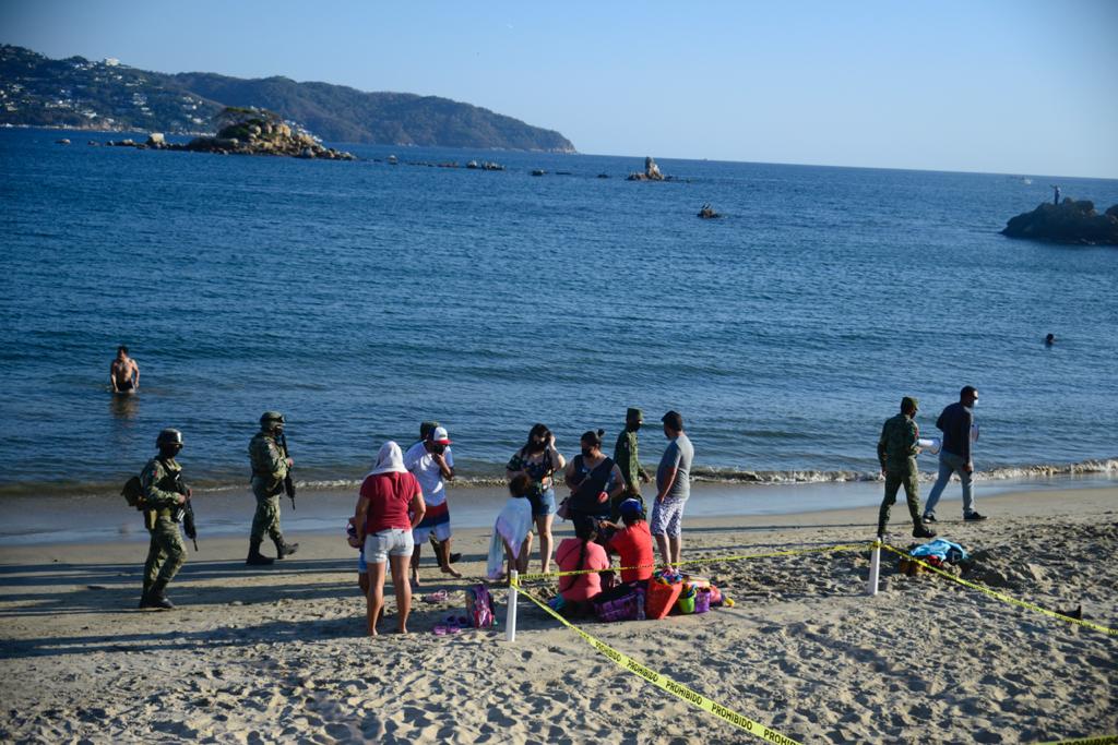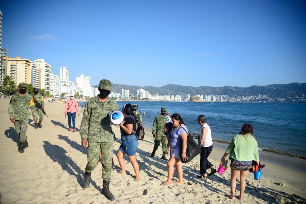 En Acapulco, a pesar de la prohibición del uso de las playas después de las 17:00 horas, cientos de turistas, prestadores y comerciantes desobedecen las medidas sanitarias, por lo que elementos del Ejército los dispersan para evitar contagios de coronavirus.