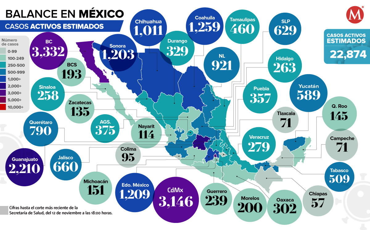 Baja California sobrepasa a Ciudad de México, reportando 3 mil 332 contagios activos, mientras que la capital de la República contabiliza 3 mil 146; en Guanajuato hay 2 mil 210, Coahuila tiene mil 259, y Estado de México tiene mil 209.
