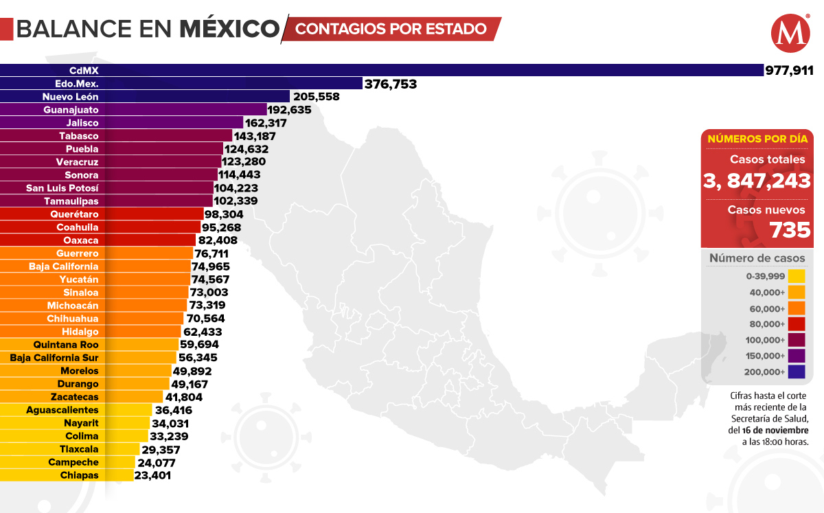 De acuerdo con la Secretaría de Salud (Ssa), en las últimas 24 horas México sumó 735 nuevos contagios de coronavirus, acumulando un total de 3 millones 847 mil 243 casos.