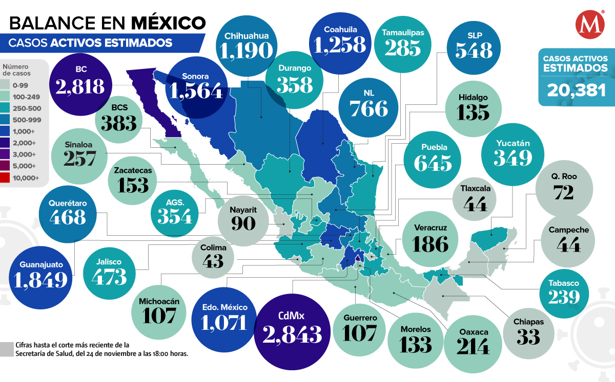 Ciudad de México tiene un estimado de 2 mil 843, y Baja California reporta 2 mil 818; Guanajuato contabiliza, mil 849 enfermos, en Sonora hay mil 564, y en Coahuila se estiman mil 258.