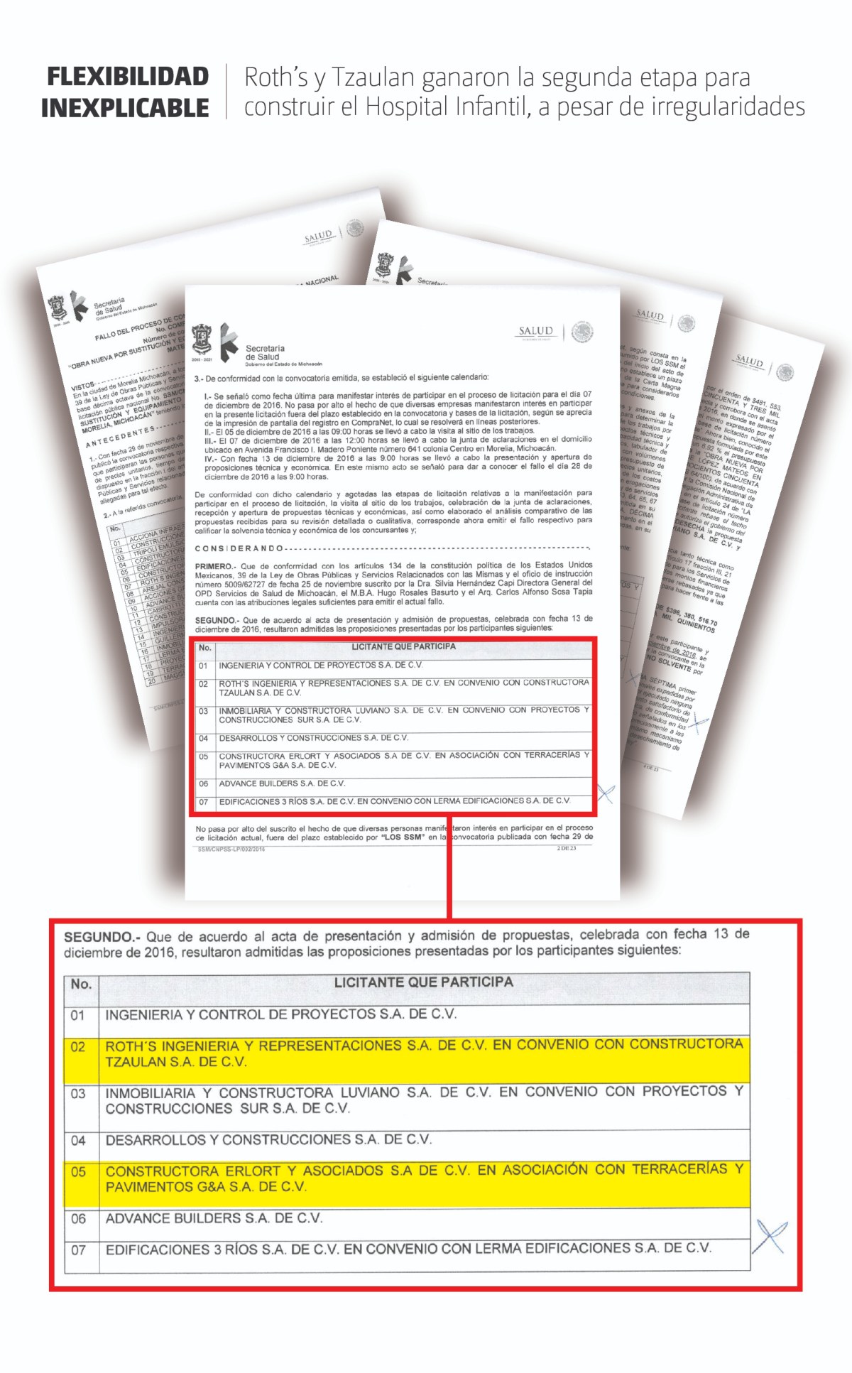 Otro consorcio favorecido fue el integrado por la alianza Roth’s Ingeniería y Constructora Tzaulan, la cual ganó el mayor contrato de su historia: 430.2 millones de pesos en una licitación irregular que permitió competir a Constructora Erlort y Asociados, propiedad de los mismos dueños de Roth’s, Manuel Leonardo, Luis Erwin y Luz Eugenia Rodríguez Torres. Es el único contrato que han ganado estas empresas en Michoacán, donde les aprobaron diez convenios para obtener 160.1 millones de pesos adicionales y un año y medio más de tiempo para entregar la obra, sin sanción alguna.