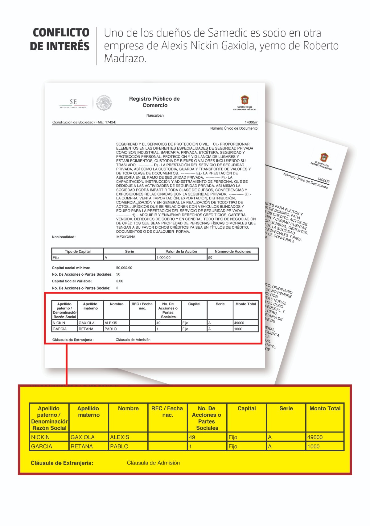 La conexión existente entre Alexis Nickin Gaxiola (yerno del priísta Roberto Madrazo y dueño de Hova Health) con Samedic se da a través de Pablo García Retana, socios en la empresa Squad I Burks, dedicada a la seguridad privada, aunque Nickin tiene 49 de las 50 acciones.