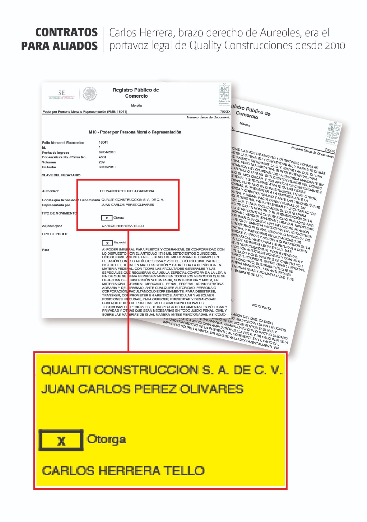 El brazo derecho de Aureoles era representante legal de Quality Construcciones desde marzo de 2010. Esta compañía cambió su nombre a GCQ Construcciones en 2016. Su poder era tan amplio que incluso podía vender la empresa.