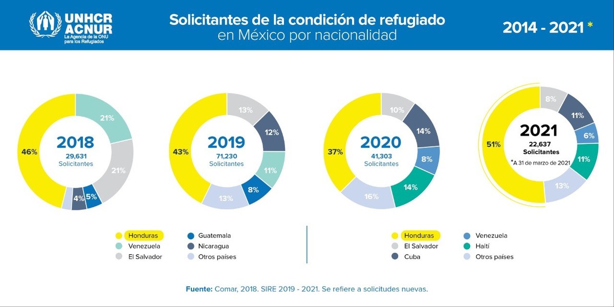 Precisó que, en el primer trimestre de 2021, la Comisión Mexicana de Ayuda a Refugiados (Comar), registró 22 mil 606 nuevas solicitudes de asilo, esto fue un 31 por ciento más que en el primer trimestre de 2020 y un aumento del 77 por ciento con respecto al mismo período en 2019; mientras que marzo de este año marcó un máximo histórico para las solicitudes de asilo mensuales, ya que llegaron a 9 mil 76.