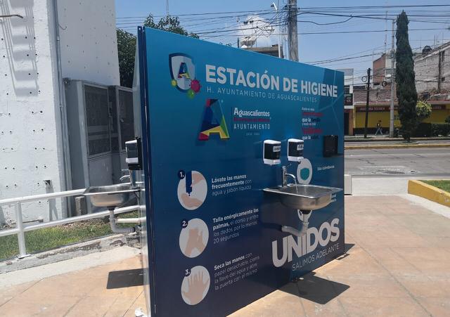 Las estaciones cuentan con lavabo de manos conectado directamente a una toma de agua, dispersor de gel antibacterial y jabón, además de mensajes preventivos.