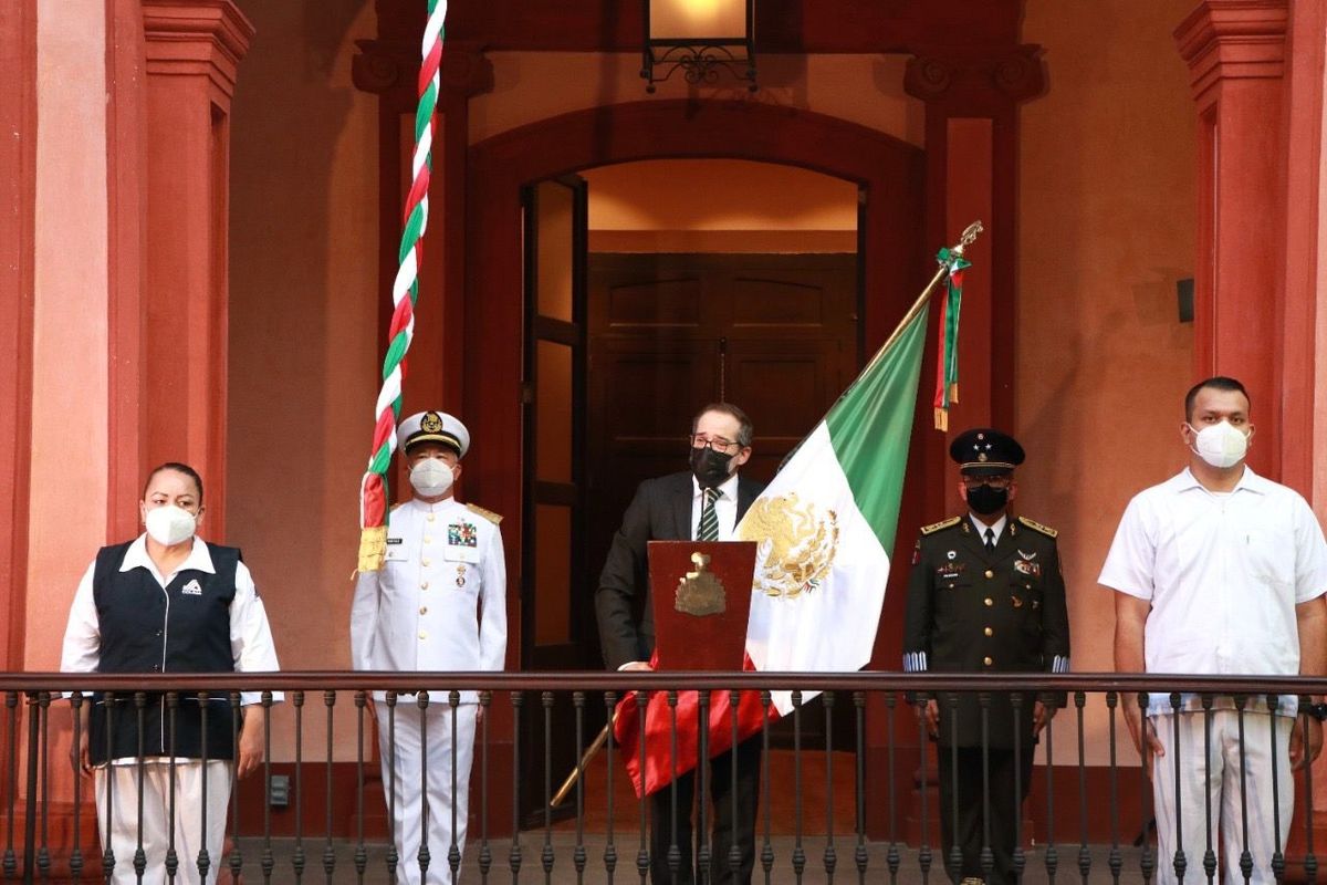 Después de realizar los honores al lábaro patrio, el jefe del Ejecutivo estatal recibió la Bandera Mexicana, de parte de la escolta de la 24/a Zona Militar y llamó a la población a celebrar en familia este CCXI aniversario del inicio de la lucha por la independencia nacional, sin arriesgar su salud.