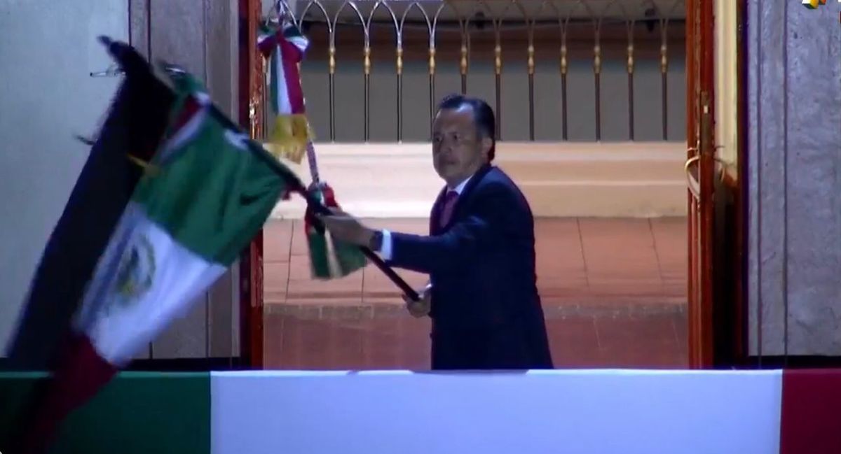 Con un semblante serio, después de los “vivas”, el gobernador ondeó la bandera de México pero olvidó tocar la campana, parte fundamental del protocolo, e inmediatamente después entonó el himno nacional mexicano.