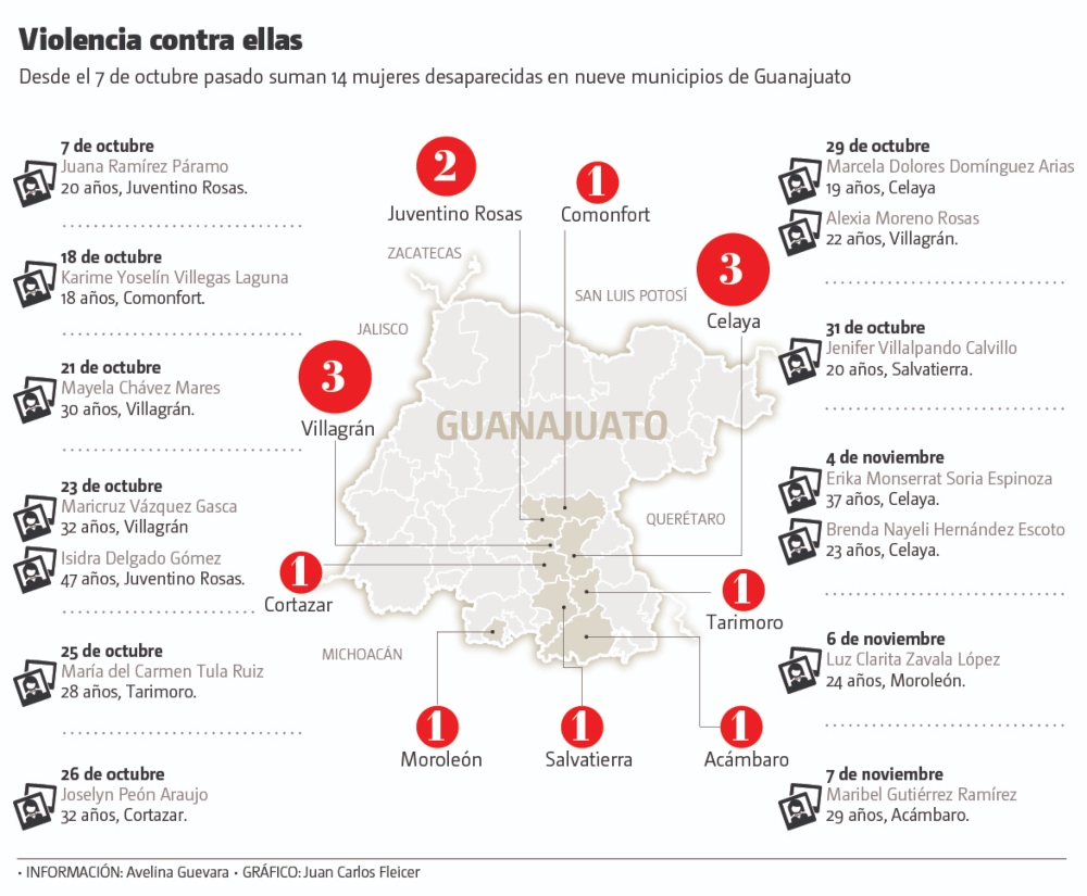 El primer protocolo de desaparición de una mujer se activó el 7 de octubre por Juana Ramírez Páramo, de 20 años, originaria de Juventino Rosas; el 18 de octubre fue por Karime Yoselín Vilegas Laguna, de 18 años, originaria de Comonfort, ciudad catalogada como Pueblo Mágico y lugar en donde este año los hechos violentos se han incrementado.