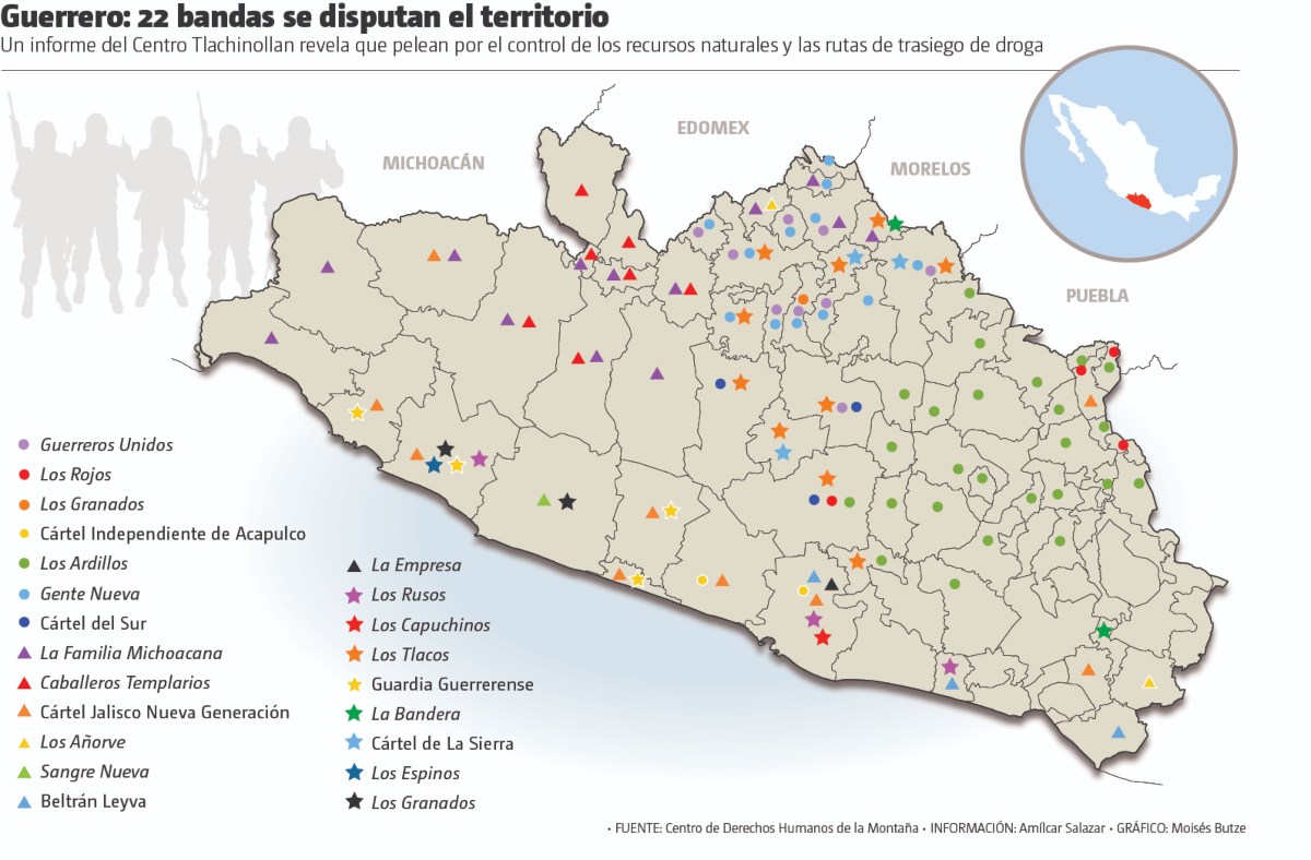 Guerrero tiene una nueva reconfiguración política y criminal, esta última cada vez con mayor presencia en las comunidades indígenas, pues según el Centro de Derechos Humanos de la Montaña Tlachinollan, al menos 22 grupos delincuenciales se estarían disputando el control de los recursos naturales y las rutas de trasiego de droga en el estado, traduciéndose en extorsión, narcomenudeo, o incluso, desplazamiento forzado en comunidades enteras.