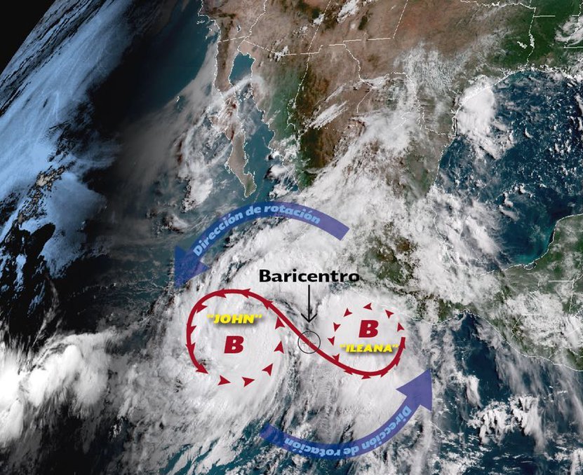 Este efecto es la interacción entre dos ciclones tropicales que tienen una distancia entre sí de menos de mil 200 kilómetros, al rotar o moverse con una trayectoria ciclónica.