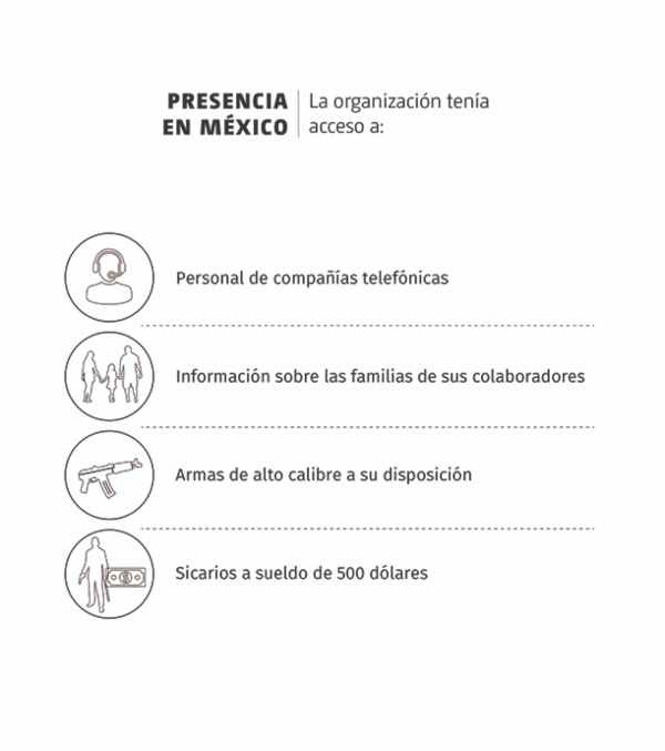 Además de las reuniones con cárteles de la droga, la organización tenía acceso a personal de compañías telefónicas, información sobre las familias de sus colaboradores, acceso a armas de alto calibre y sicarios que por una tarifa de 500 dólares podían asesinar a pedido.
