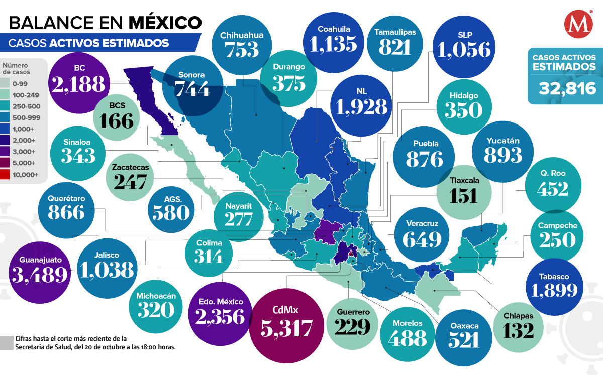 Aproximadamente hay 32 mil 816 casos activos en la República Mexicana: encabezando a los estados que suman un mayor número de activos se encuentra la Ciudad de México con 5 mil 317; Guanajuato contabilizó 3 mil 489, sobrepasando al Estado de México que cuenta 2 mil 356.