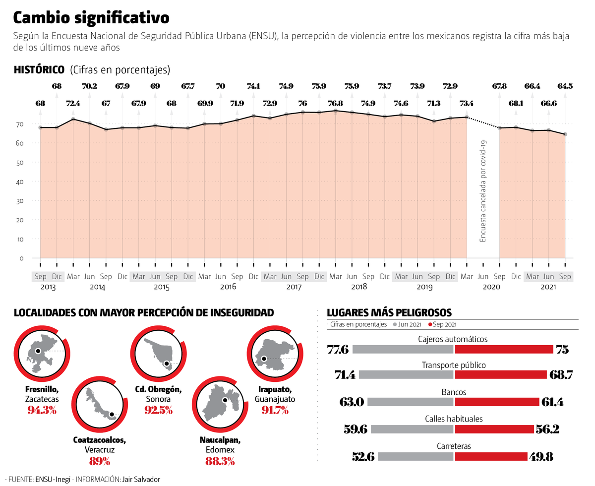 En lo que va del presente sexenio, la sensación de inseguridad entre los habitantes ha caído 9.2 puntos porcentuales, pues en diciembre de 2018 se tenía una media de 73.7 por ciento.