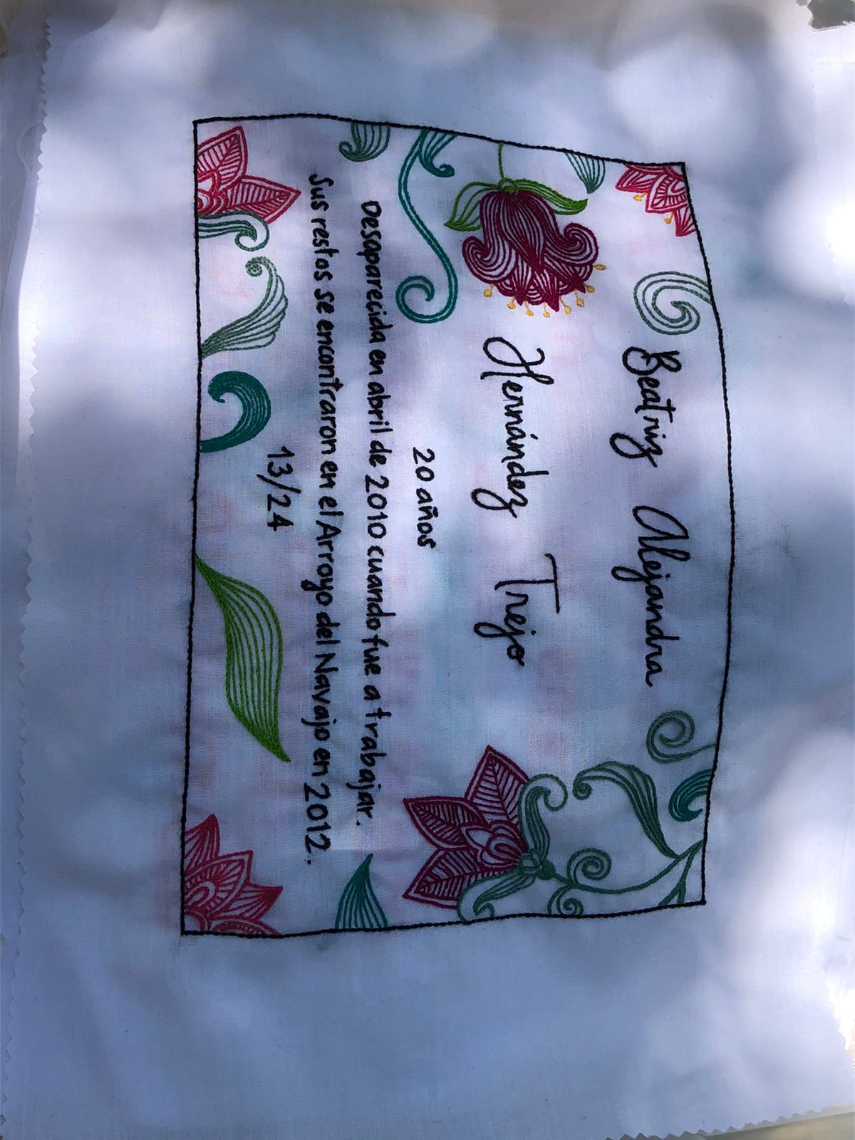 Hazel Dávalos, integrante del colectivo “Bordamos por la Paz”, informó que están bordando la historia de 30 años de feminicidios, los casos de 1990 a 2020, con el objetivo de denunciar, sensibilizar, hacer un memorial ciudadano, documentar un fenómeno delictivo que sigue registrándose en la frontera de Juárez y hacer una recuperación en textil del feminicidio.