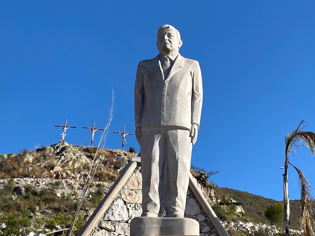 El monumento de López Obrador está hecho con cantera rosa tiene un peso de 400 kilogramos, fue colocado a lo alto de un montículo a unos 2 kilómetros del poblado de La Gotera, enclavado en los límites con Guanajuato y desde ahí pareciera que vigila a todos.