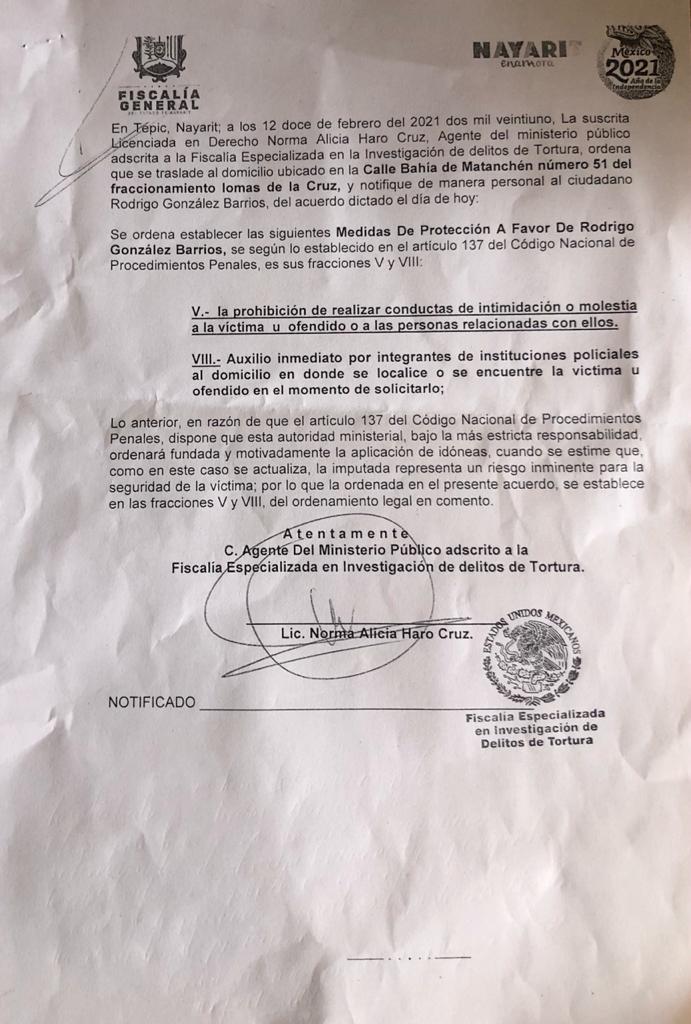 MILENIO tuvo acceso al documento y está firmado por la Fiscalia Especializada en Invetigacion de Delitos de Tortura local, donde aseguran que se establecen medidas de protección a fin de evitar que se les realicen intimidaciones a las victimas. Además que se proporciona auxilio inmediato.