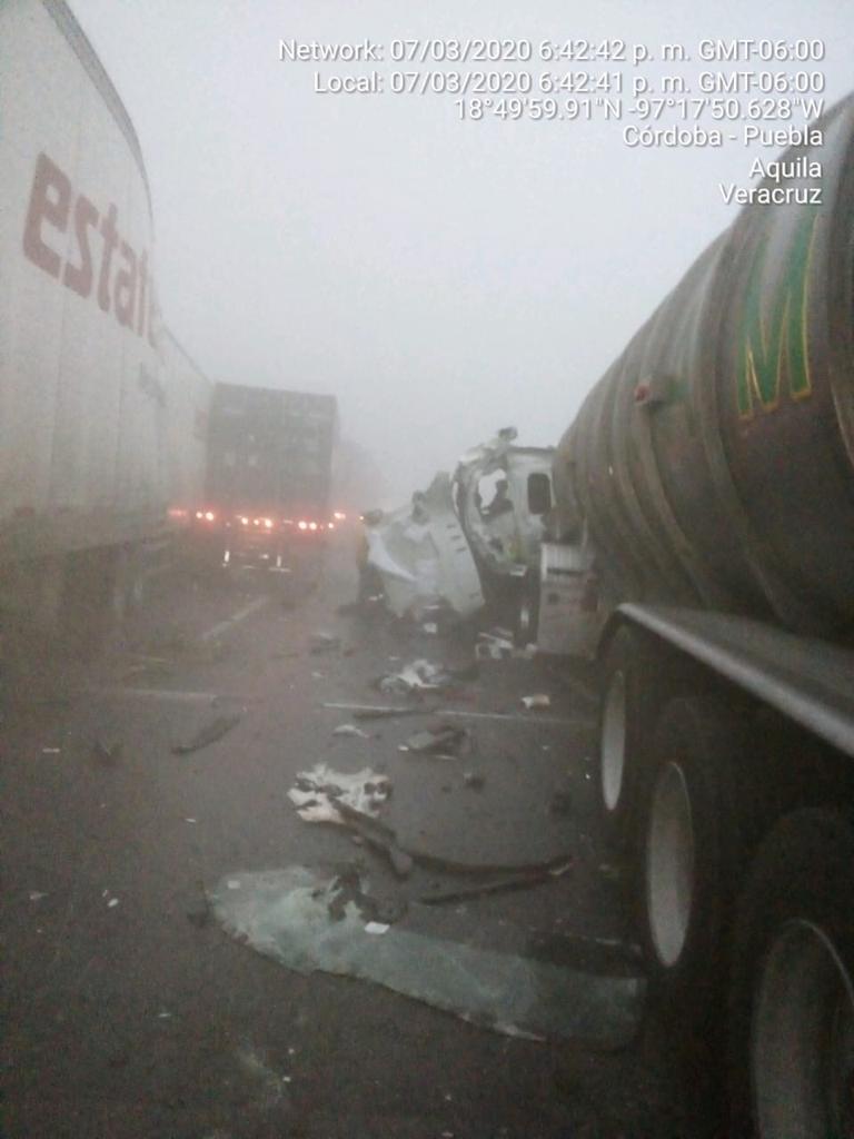 La densa niebla, lluvia y la falta de precaución, provocaron una carambola en la autopista Córdoba-Puebla en el tramo de Acatzingo-Ciudad Mendoza, a la altura del kilómetro 228 en el municipio de Aquila, Veracruz.