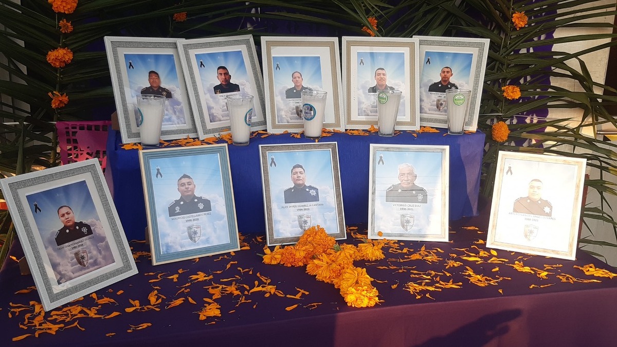 Las fotografías de una decena de policías fueron colocadas en el altar de los bajos del palacio municipal.