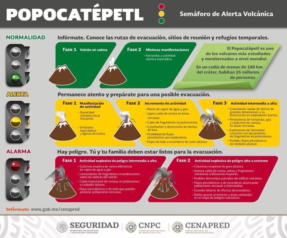 El Centro Nacional de Prevención de Desastres(Cenapred) determinó elevar el semáforo de alerta volcánica de Amarillo Fase 2 a Fase 3 ante la reciente actividad del volcán Popocatépetl.