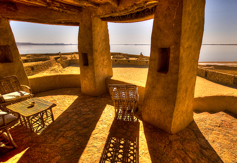 Adrère Amellal significa montaña blanca en lengua bereber y se refiere al enorme acantilado de piedra caliza bajo el cual se asienta el hotel. Construido en 2000 con el material local utilizado en el oasis durante siglos y conocido como kershef –una mezcla de sal de roca y arcilla– el hotel de color tierra parece ser casi una saliente orgánica de su entorno.