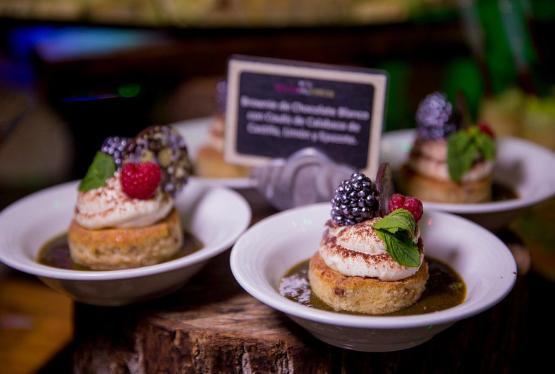 Para cerrar con broche de oro, se hizo presente en las mesas un pastel de chocolate oaxaqueño bañado con salsa de cacao y ahumado con semilla de copal. En entrevista con Notivox Viajes, el chef Hoshimar relató por qué este postre es especial: la salsa de chocolate de cada uno de los platos fue elaborada en metate. Para esto, los metates se dejaron al sol por varias horas y al moler el cacao también estuvieron en contacto con el fuego para que la salsa se sirviera completamente líquida y así bañar el delicioso pastel.