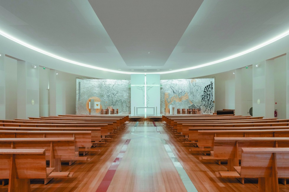 Es importante destacar que la arquitectura del proyecto está directamente influenciada por los símbolos litúrgicos, presentes en la forma elíptica de la iglesia, como referencia del cáliz y la cruz de la pasión, así como en diversos detalles a lo largo del recorrido.