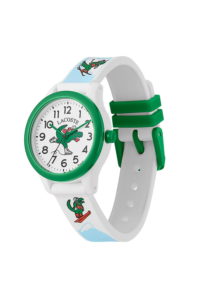 En esta colección, el reptil aparece en la carátula patinando sobre hielo, acompañado de los números para facilitar la lectura del reloj. La correa blanca de silicón está adornada con el lagarto esquiando en diferentes momentos. Su diseño cuenta con una caja redonda blanca con contraste en el bisel a través del uso del color verde. Croc Magic es una colección exclusiva para esta temporada de fin año.