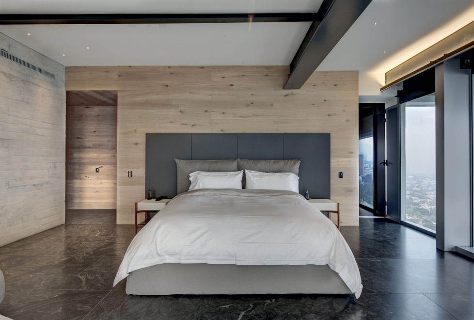 A través de volúmenes de distintos materiales se separó cada área del departamento. En la zona pública un escultórico bloque de mármol funciona de recepción, otro de concreto contiene la cocina y los servicios, y uno más de madera brinda privacidad al family room. Este último se prolonga hasta la segunda planta, en donde se encuentran la recámara principal y las infantiles, las cuales se separan por medio de lambrines corredizos permitiendo al mismo tiempo convivencia y privacidad.