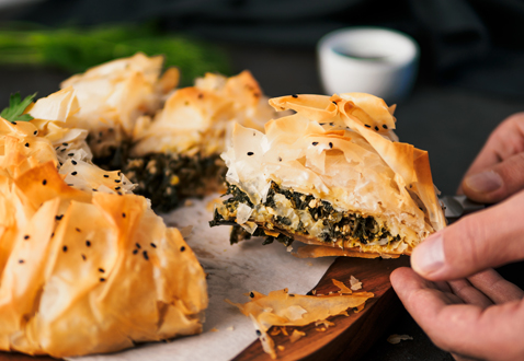 Tarta de masa de hojaldre rellena con espinacas y queso feta. Es simplemente gloriosa, además de que la encontrarás en cualquier rincón de Grecia, ya que tiene más de 400 años de antigüedad.