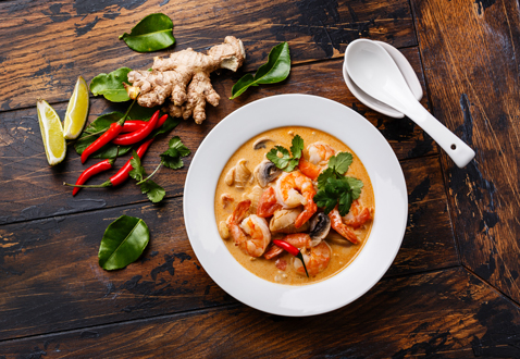 Esta sopa es de las más conocidas y preferidas de la cocina tailandesa. La receta es simple y suculenta: lleva leche de coco, mariscos y hierbas aromáticas.
