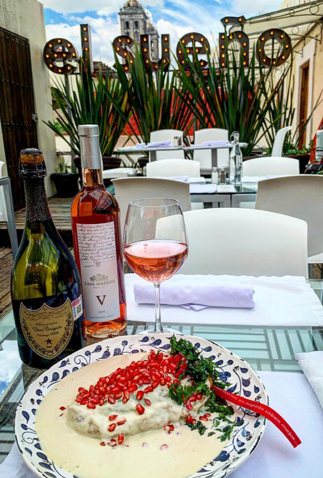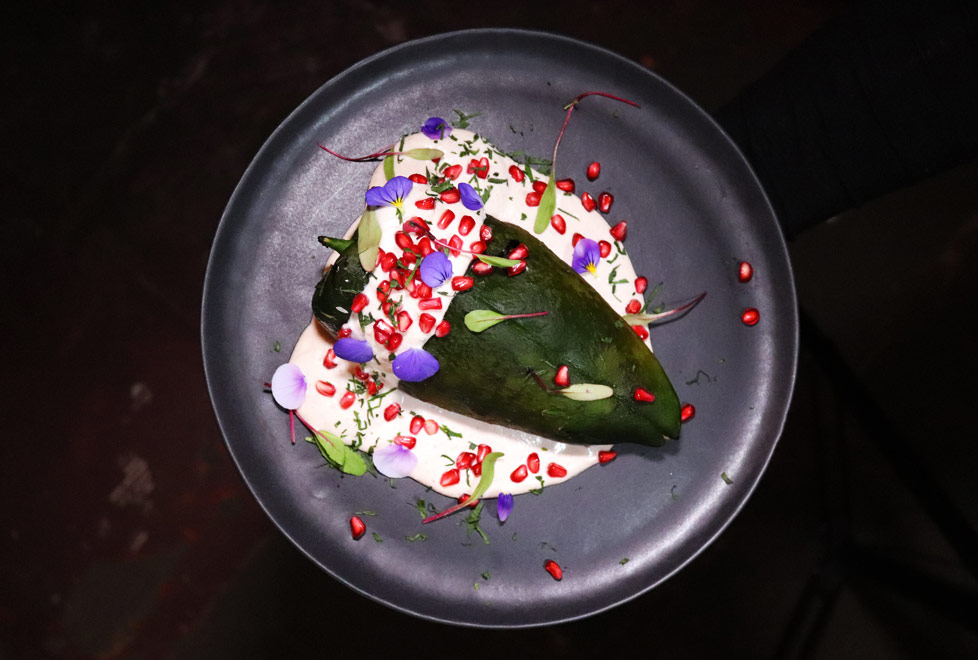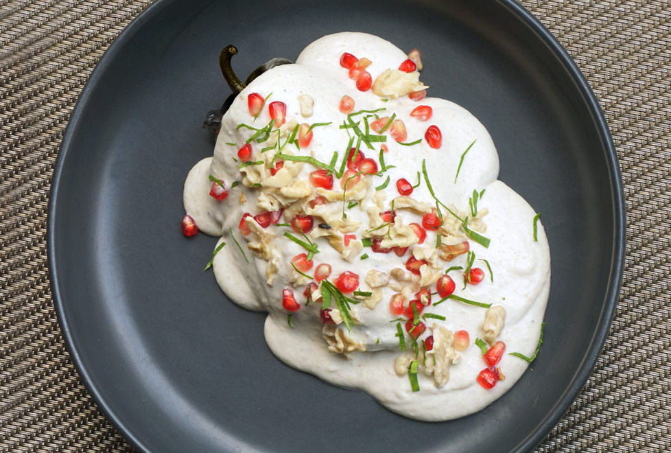 Pensada para agasajar el paladar capitalino, la receta del chef Othón Gayosso incorpora elementos novedosos como la carne de cordero y agrega a su nogada, hecha con requesón, un flameado de Ancho Reyes, un licor a base de chile ancho. El plato llega a la mesa decorado con granada y brotes de flores. Este es un chile ideal para quien desee no saturar el paladar de los sabores dulces de la fruta. e ideal para las tardes veraniegas. Para extender el placer, hay que elegir vino rosado como el Rondo Rosé.