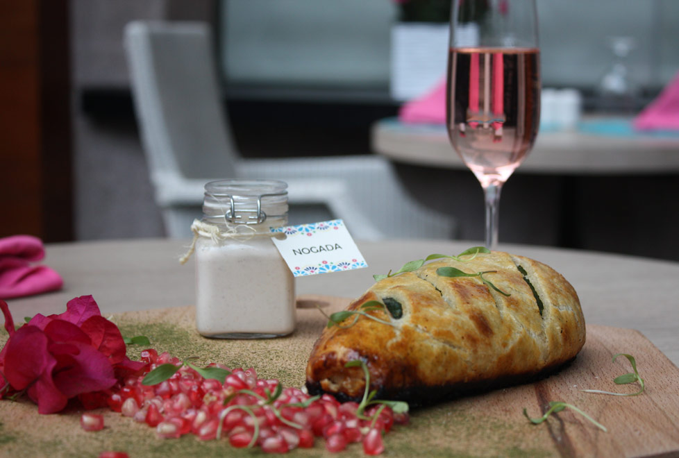 Para su relleno, la chef Jennifer López eligió carne molida de res y cerdo que llegan a la mesa sazonadas con manzana, durazno, pera y frutos rojos. La nogada tiene queso de cabra, piñón y jerez. El chile poblano se sirve envuelto en una pasta de hojaldre, que al mismo tiempo es blanda y crujiente, la que se fusiona con los demás ingredientes. El maridaje sugerido para destacar los sabores es una copa de champaña rosada Taittinger.
