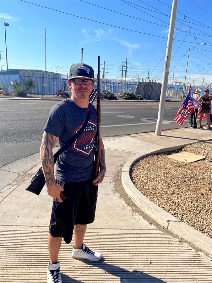 Con un AK-46 y otro rifle, Joshua es uno de los seguidores del presidente de los Estados Unidos, Donald Trump, que patrulla frente al centro de cómputo de votos que se ha hecho más famoso del país, el del condado de Maricopa, Arizona. Pide a gritos que su sufragio se tenga en cuenta.