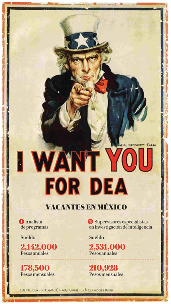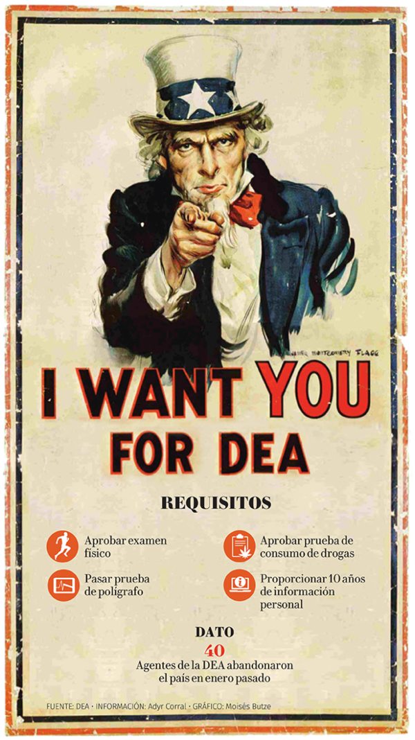 El puesto, con dos vacantes en México, está disponible para empleados de la DEA únicamente. Entre algunos de los requisitos para el puesto está que pasen un examen físico impuesto por el Departamento de Estado y una prueba de polígrafo.