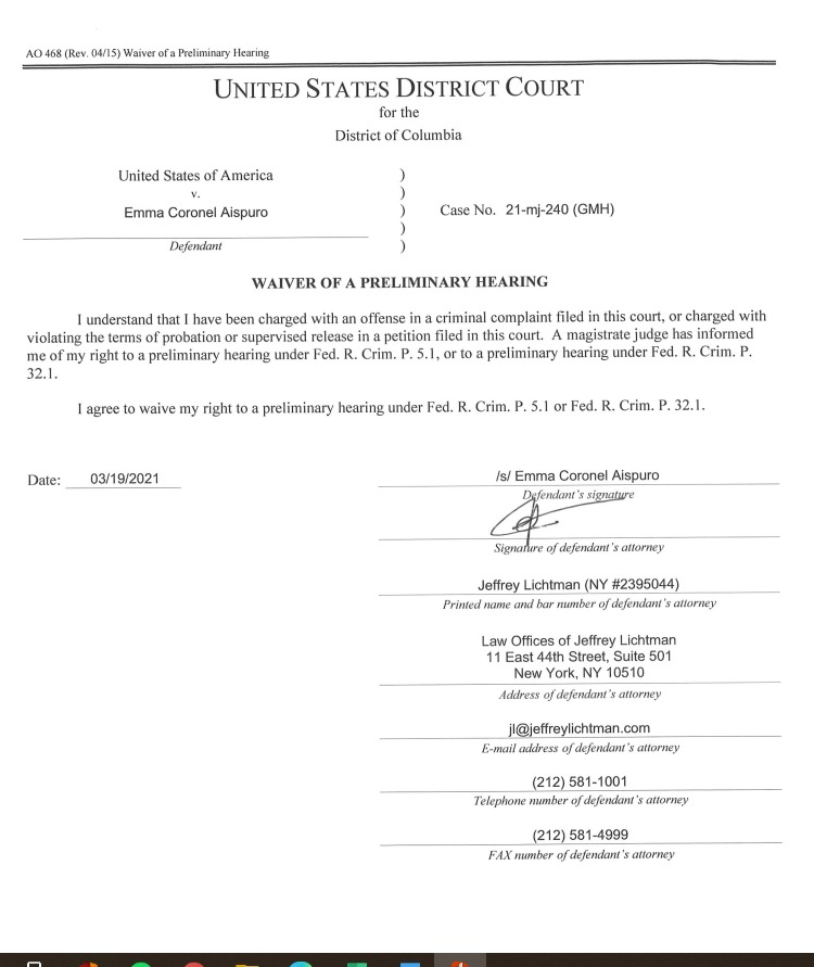 Emma Coronel Aispuro, en resguardo en la cárcel local del condado de Alexandria, en Virginia, renunció a su derecho a tener una audiencia preliminar, la cual aun no tenía una fecha establecida.