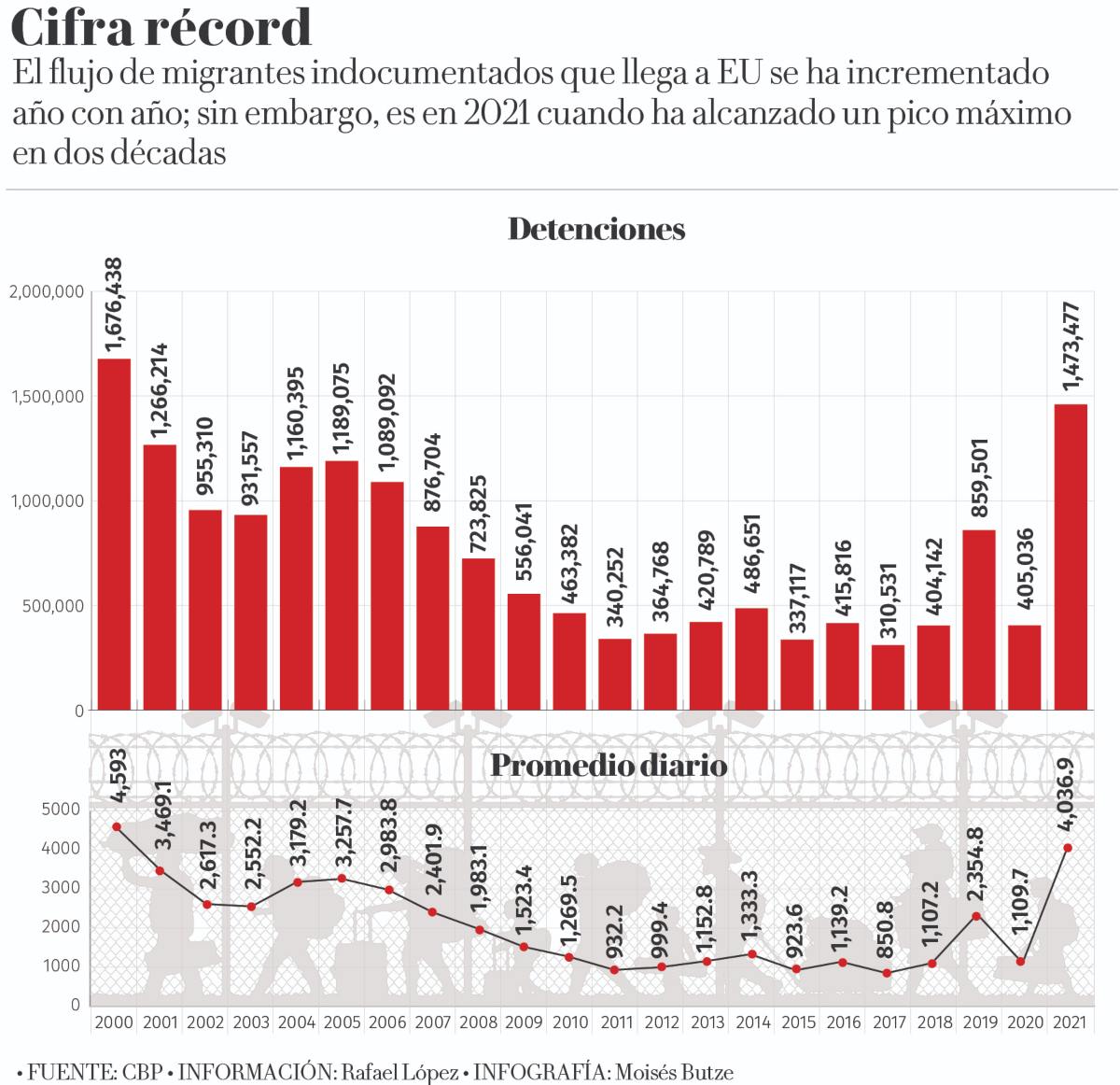 A un mes para que concluya el año fiscal 2021, las autoridades migratorias de Estados Unidos han detenido a un millón 473 mil 477 migrantes, la segunda cifra más alta desde el año 2000, de acuerdo con reportes de la Oficina de Aduanas y Protección Fronteriza de Estados Unidos (CBP por su sigla en inglés).