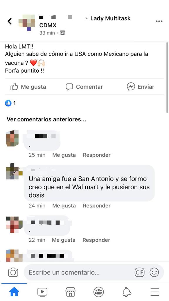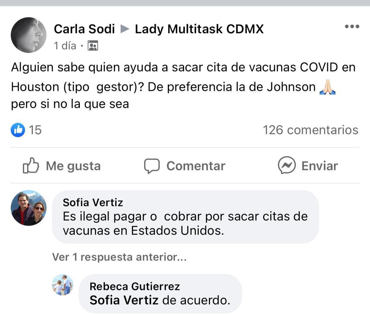 En grupos de Facebook hay quienes incluso preguntan por "gestores" que, con costo, les ayuden a registrarse para irse a vacunar, lo cual es ilegal en ese país.