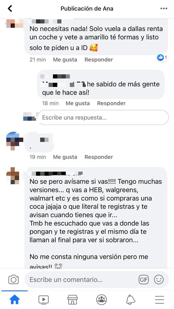 "Mis papás se pudieron vacunar en Florida cuando aún no era necesario presentar comprobante de residencia. Yo y mi hermano logramos vacunarnos en San Antonio. No piden nada. Hay que meterse a los sitios de registro, llenar el formulario en el que te preguntan el nombre, la fecha de nacimiento y si tienes alguna enfermedad. Ahí le pones que sí tienes, pues nosotros no somos mayores de 65 y para vacunarte hay que poner eso. Al llegar con tu cita te vacunan y No te preguntan nada más", dijo un joven mexicano al que ya le aplicaron las dos dosis de la vacuna de Pfizer.