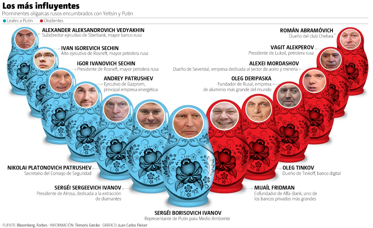 El ejemplo estaba puesto. Putin convocó a sus oligarcas para alinearlos como medida preventiva porque, en parte, la estrategia de Estados Unidos y la Unión Europea al imponer sanciones individuales contra 26 de ellos, obstaculizar el comercio y limitar el acceso ruso al sistema financiero, tiene el objetivo de enfrentarlos con el presidente, de crear una fractura que, sumada al descontento popular y acaso el de los militares, pudiera provocar la caída del presidente.