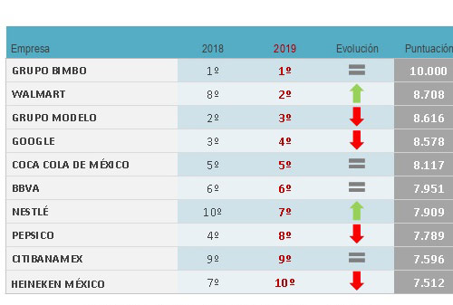 Grupo Bimbo se mantuvo por tercer año consecutivo como la empresa con mejor reputación corporativa en el país, seguido por Walmart, Grupo Modelo, Google y Coca Cola, según el ranking anual del monitor de empresas Merco.
