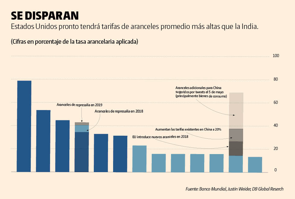 La guerra comercial también convierte a EU en un país muy proteccionista: sus aranceles ponderados posiblemente pronto serán más altos que los de India.