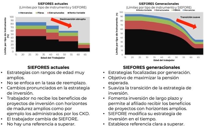 En el nuevo esquema, las Siefores se transforman en Fondos Generacionales, conocidos en inglés como Target Date Funds, que permite que los recursos de cada trabajador sean asignados a la Siefore asociada a su fecha de nacimiento y son mantenidos en ésta durante toda la vida laboral del trabajador.