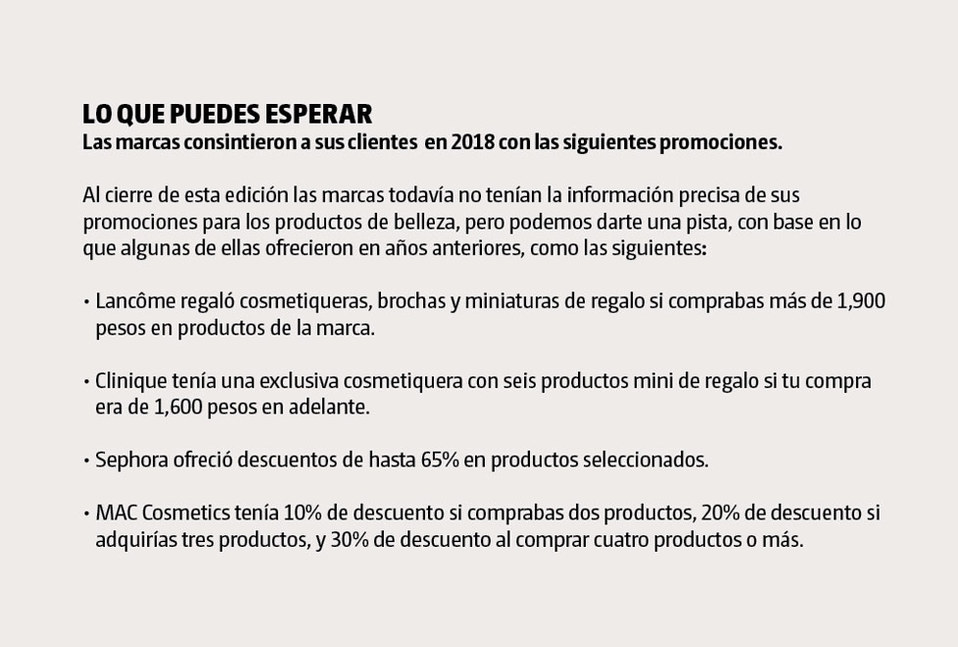 “Sabemos que es difícil encontrar una crema que elimine por completo arrugas o líneas de expresión, pero siempre habrá una que ayude a retrasarlas”, dice Uribe. Este fin de semana, encontrarás combos que incluyen crema para el rostro, para el contorno de ojos y para las manchas. “Puedes aprovechar los paquetes que ofrecerán varias marcas, ya que el precio mejora cuando compras más de un producto”, dice Guadalupe.