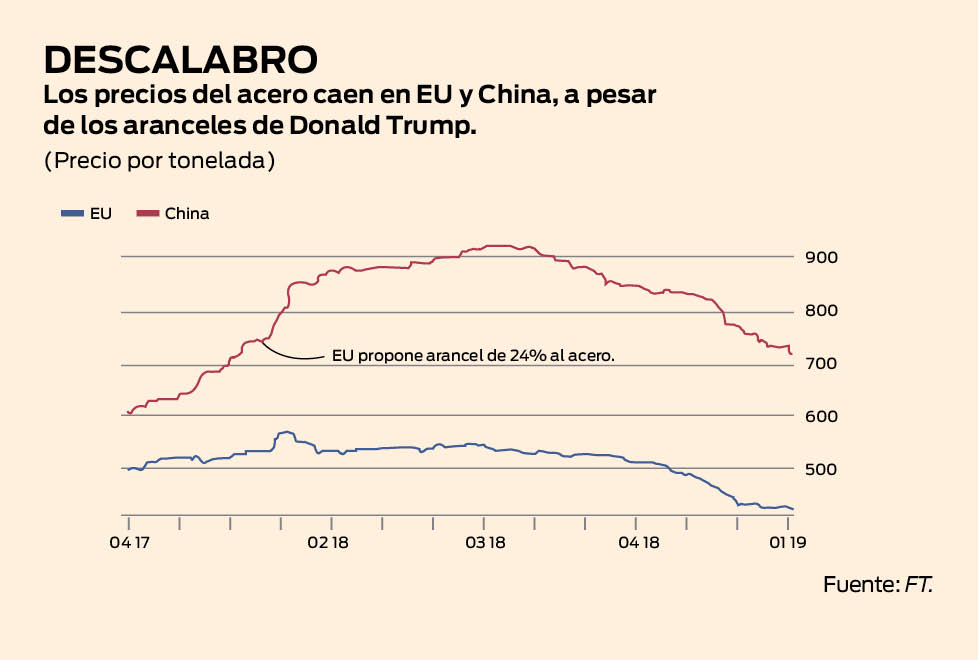 Ese es el nivel más bajo desde antes de que el secretario de Comercio de EU, Wilbur Ross, recomendara al presidente Trump imponer un arancel global de, al menos, 24% sobre las importaciones de acero, conforme a la Sección 232 de la Ley de Expansión Comercial de 1962. La caída de los precios presiona a los fabricantes de acero de EU, a quienes Trump ha tratado de ayudar con su estrategia arancelaria, con resultados mixtos.