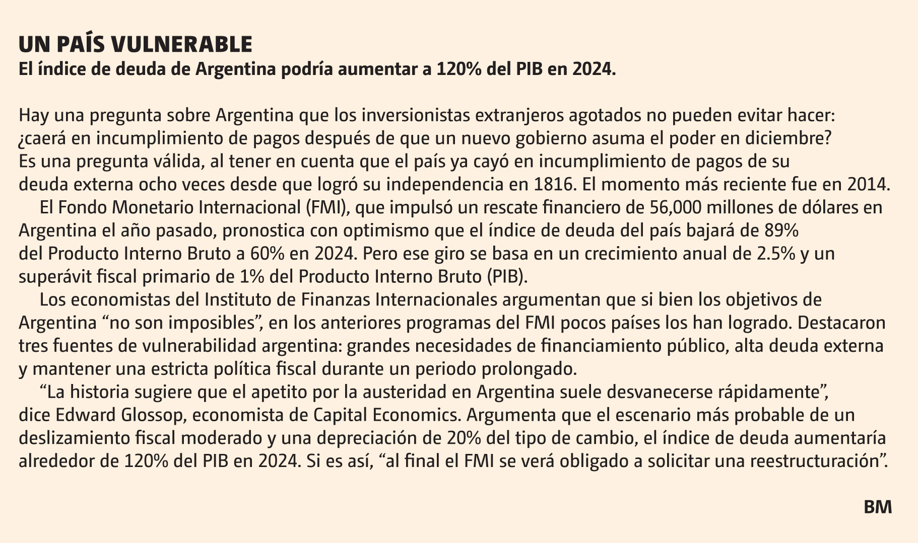 El problema ahora es si el próximo gobierno puede hacer las cosas mejor. “No importa quién gane, la pregunta es si Argentina volverá a crecer después de cuatro décadas de estancamiento”, menciona Ignacio Labaqui, analista de Medley Global Advisors.