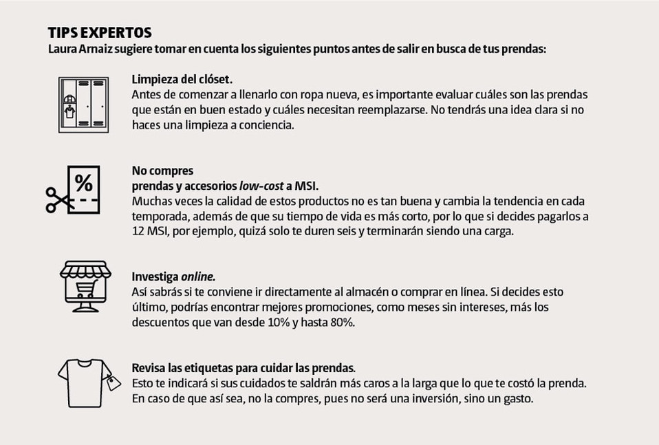 “La fast-fashion es una gran aliada de los amantes de la moda, ya que permite agregar las últimas tendencias a tu clóset, sin invertir demasiado. Lo ideal es elegir alrededor de cinco prendas que sean evidentemente de temporada, ya sea por el color o por su confección, y mezclarlas con el resto de tu ropa, para que logres un look vanguardista sin gastar de más”, dice la fashion stylist Laura Arnaiz.