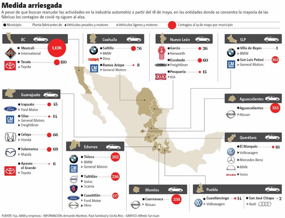 De acuerdo a la Secretaría de Salud, hasta el 13 de mayo se registraron 3 mil 623 casos de covid-19 en los municipios donde está instalada la industria automotriz, que da empleo a más del 15 por ciento de la obra industrial total en el país según datos de la Asociación Mexicana de la Industria Automotriz (AMIA).
