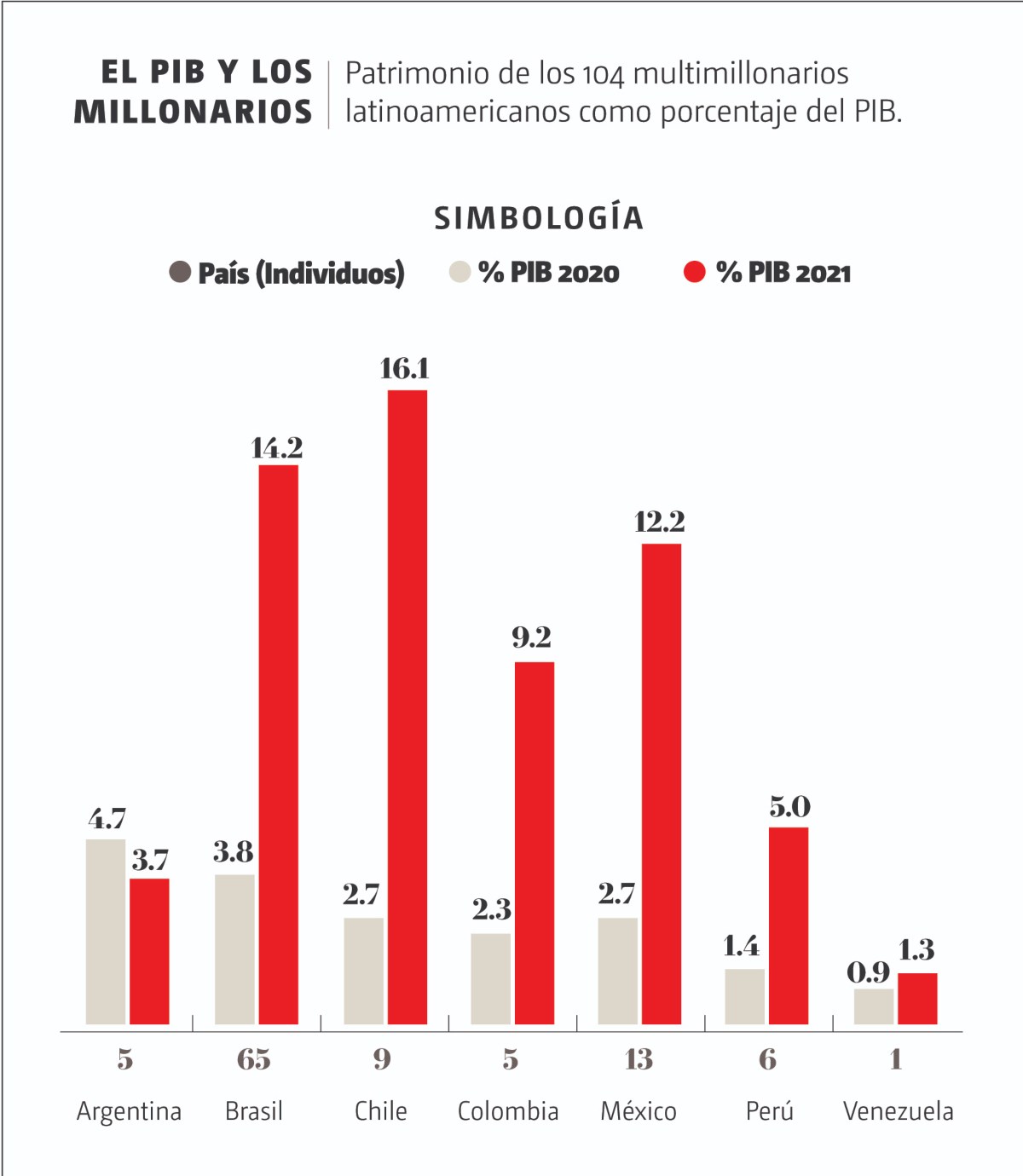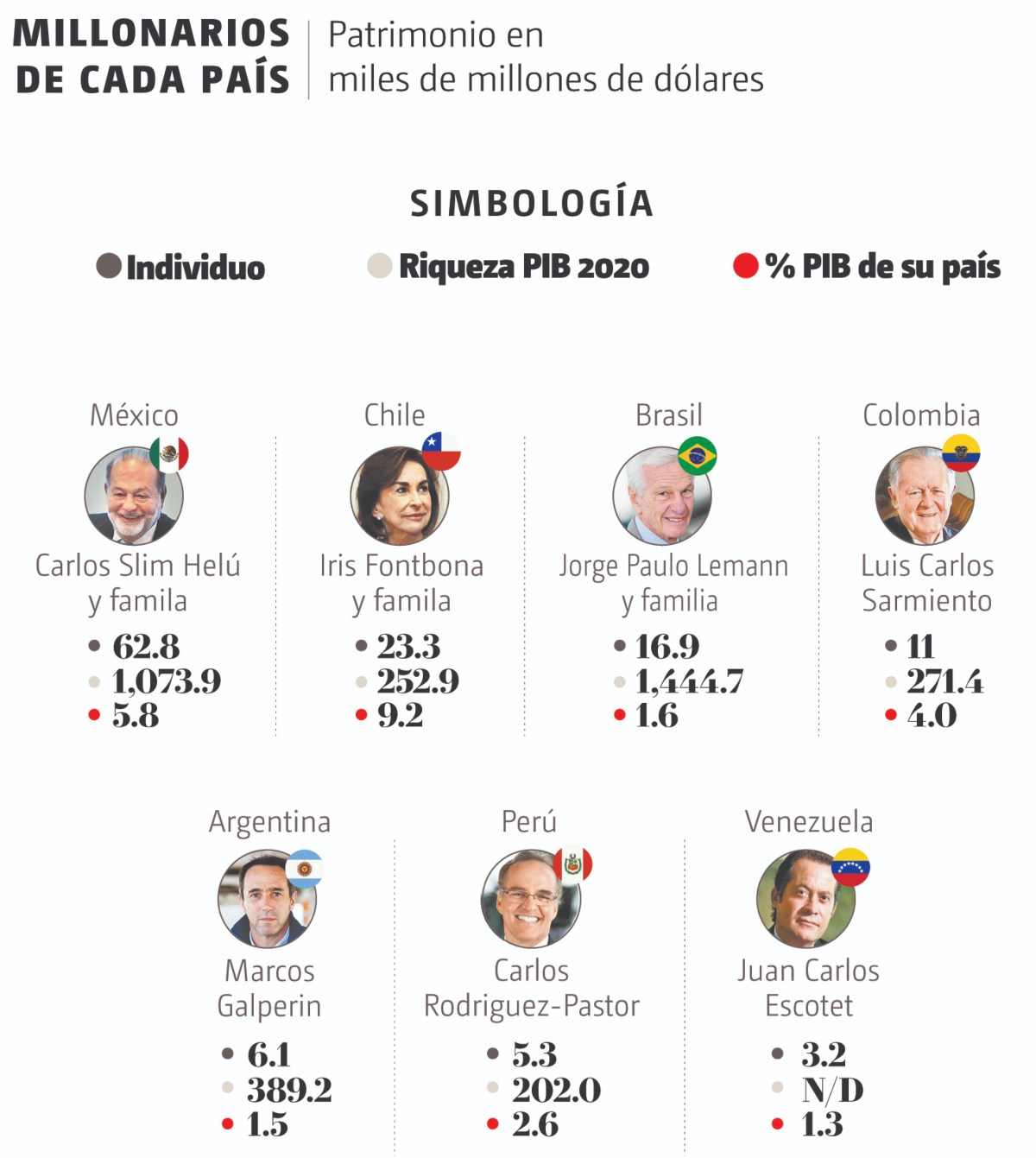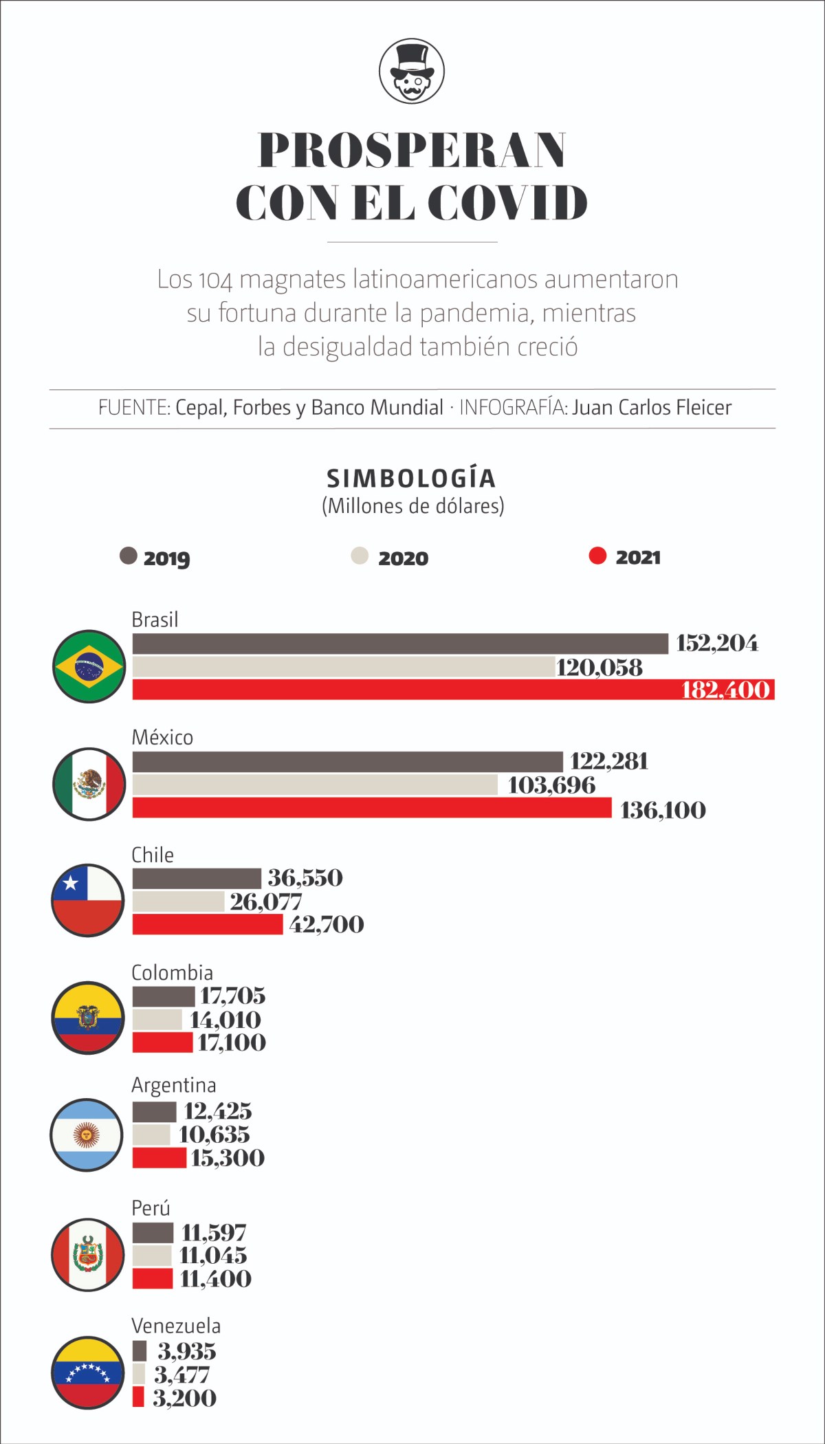La secretaria ejecutiva de la Cepal informó que entre 2019 y 2021, el patrimonio de los millonarios en siete países de la región aumentó 14 por ciento. Luego de una caída de 19 por ciento entre 2019 y 2020, la riqueza de los billonarios creció en 41 por ciento entre 2020 y 2021; y en siete países de la región en 2021, 104 personas poseen, en promedio, un patrimonio alrededor del 11 por ciento del producto interno bruto (PIB) de sus países.