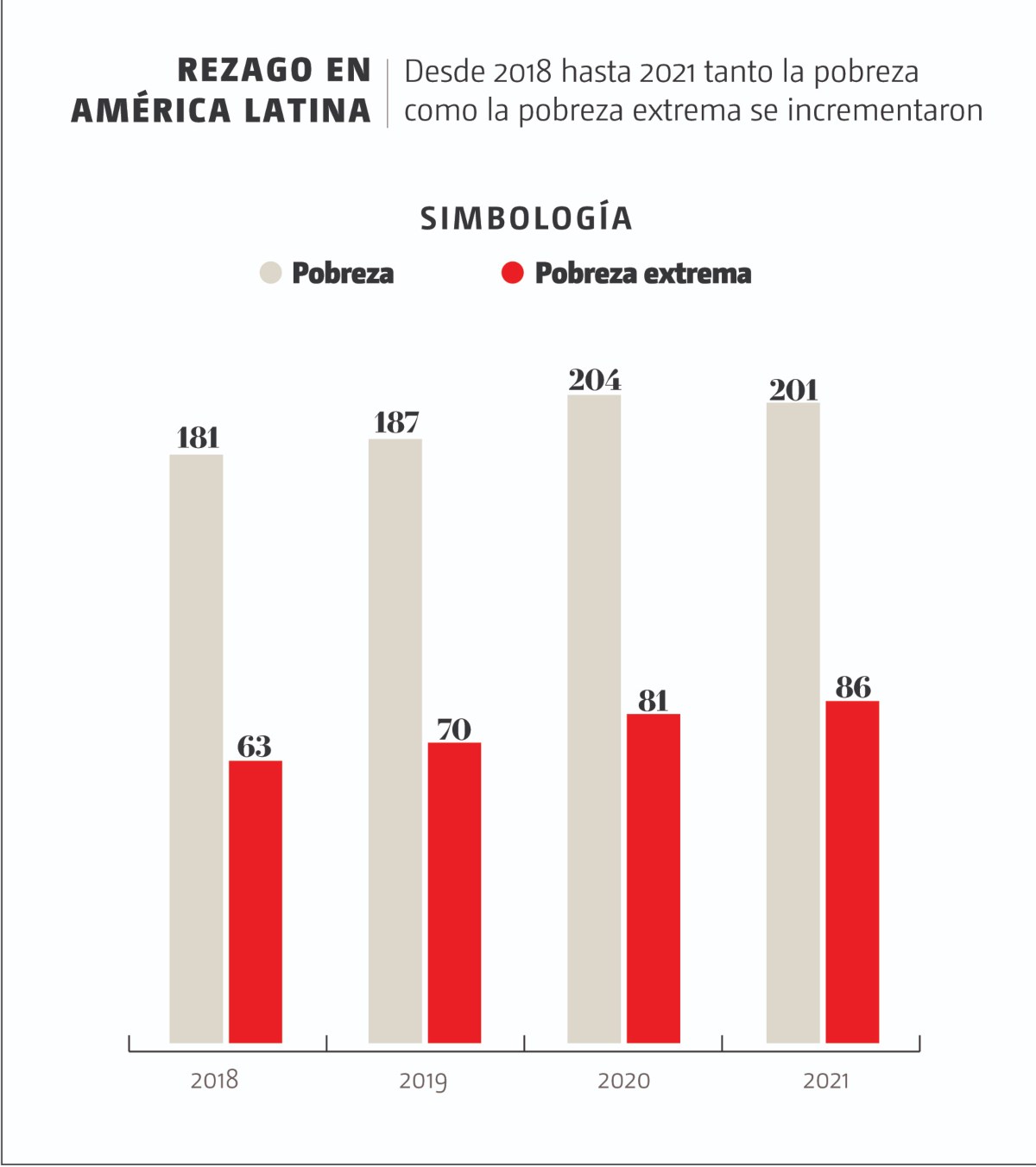La secretaria ejecutiva de la Cepal, Alicia Bárcena, refirió que si bien la pobreza tuvo una disminución entre 2020 y 2021, pues la cantidad de personas en esta condición pasó de 204 a 201 millones de personas, la pobreza extrema aumentó de 81 a 86 millones de individuos, “en 2021, a pesar de la recuperación, se proyecta un retroceso de 27 años con aumento de la pobreza extrema”, dijo.