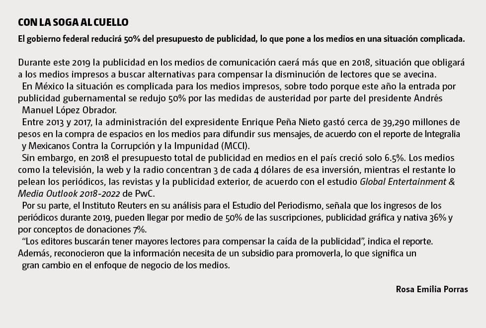 Durante la última década, los medios de comunicación se han enfrentado a un fuerte impacto económico, ya que las plataformas digitales pusieron de cabeza sus modelos de publicidad y de negocios del siglo XX. En 2006, los periódicos estadounidenses tradicionales generaron 49,000 millones de dólares (mdd) en ingresos por publicidad, después de varias décadas de aumentar las ganancias, de acuerdo con Pew Research Center.